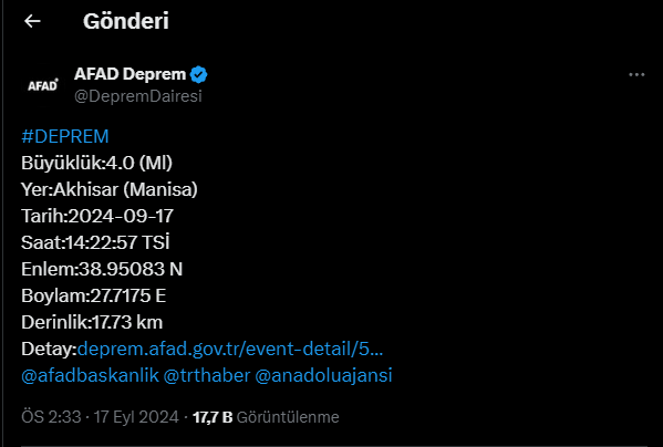 Afet ve Acil Durum Yönetimi Başkanlığının (AFAD) internet sitesinde yer alan bilgiye göre, saat 14.22’de merkez üssü Akhisar olan 4 büyüklüğünde sarsıntı kaydedildi.