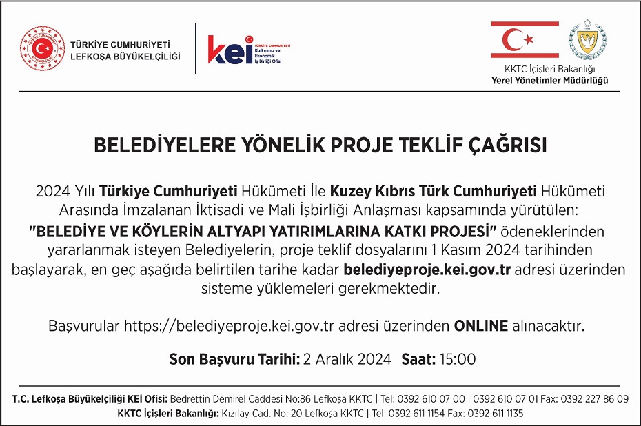 “2024 Yılı Türkiye Cumhuriyeti Hükümeti ile Kuzey Kıbrıs Türk Cumhuriyeti Hükümeti Arasında İmzalanan İktisadi ve Mali İşbirliği Anlaşması kapsamında yürütülen ‘Belediye Ve Köylerin Altyapı Yatırımlarına Katkı Projesi’ ödeneklerinden yararlanmak isteyen Belediyelerin, proje teklif dosyalarını 1 Kasım 2024 tarihinden başlayarak, en geç aşağıda belirtilen tarihe kadar belediyeproje.kei.gov.tr adresi üzerinden sisteme yüklemeleri gerekmektedir. Başvurular https://belediyeproje.kei.gov.tr adresi üzerinden online alınacaktır. Son başvuru tarihi: 2 Aralık 2024 saat: 15.00.”
