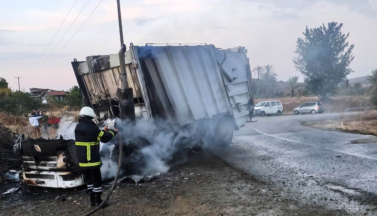 Lefke’de, bugün saat 16.30 sıralarında, Aplıç Yolu üzerinde seyir halinde bulunan Güzelyurt Belediyesi’ne ait RC 772 plakalı çöp toplama kamyonu alev aldı. Polisin verdiği bilgiye göre, yangın, muhtemelen araçtan sızan yağların sıcak egzos üzerine temas etmesi sonucu çıktı. Yangın İtfaiye Ekipleri tarafından söndürüldü ancak araç tamamen yanarak kullanılmaz hale geldi. Olaya ilişkin soruşturma devam ediyor.