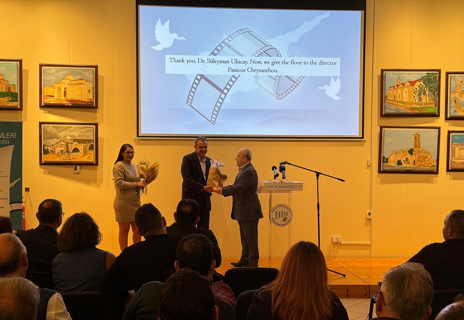 Açılış töreni konuşmalarının ardından Dr. Simos Ioannou, Gazimağusa Belediyesi Başkanı Dr. Süleyman Uluçay ile yönetmen Panicos Chrysanthou’ya çiçek; Uluçay da Ioannou ve Chrysanthou’ya barışın simgesi zeytin fidesi takdim etti.
