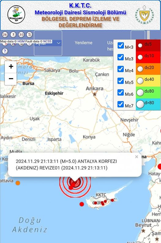 “Bugün saat 21:13 lokalde, Dairemize bağlı AKDENİZ Deprem İstasyonu’ndan yaklaşık 132km uzaklıkta ,ORTA ŞİDDETTE ve aletsel büyüklüğü Richter Ölçeğine göre ML:5.0 olan bir deprem kaydedilmiştir. Yapılan ilk değerlendirme sonucunda depremin merkez üssünün 35.86 Kuzey ve 31.68 Doğu Koordinatlarında, yaklaşık 4 km derinliğinde ANTALYA KÖRFEZİNDE olduğu saptanmıştır.”