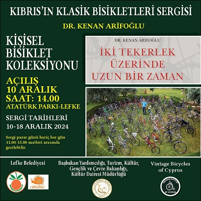 Dr. Kenan Arifoğlu’nun “İki Tekerlek Üzerinde Uzun Bir Zaman” başlıklı Otantik Bisikletler Sergisi 10 Aralık Salı günü Lefke’de Atatürk Parkı’nda açılacak.