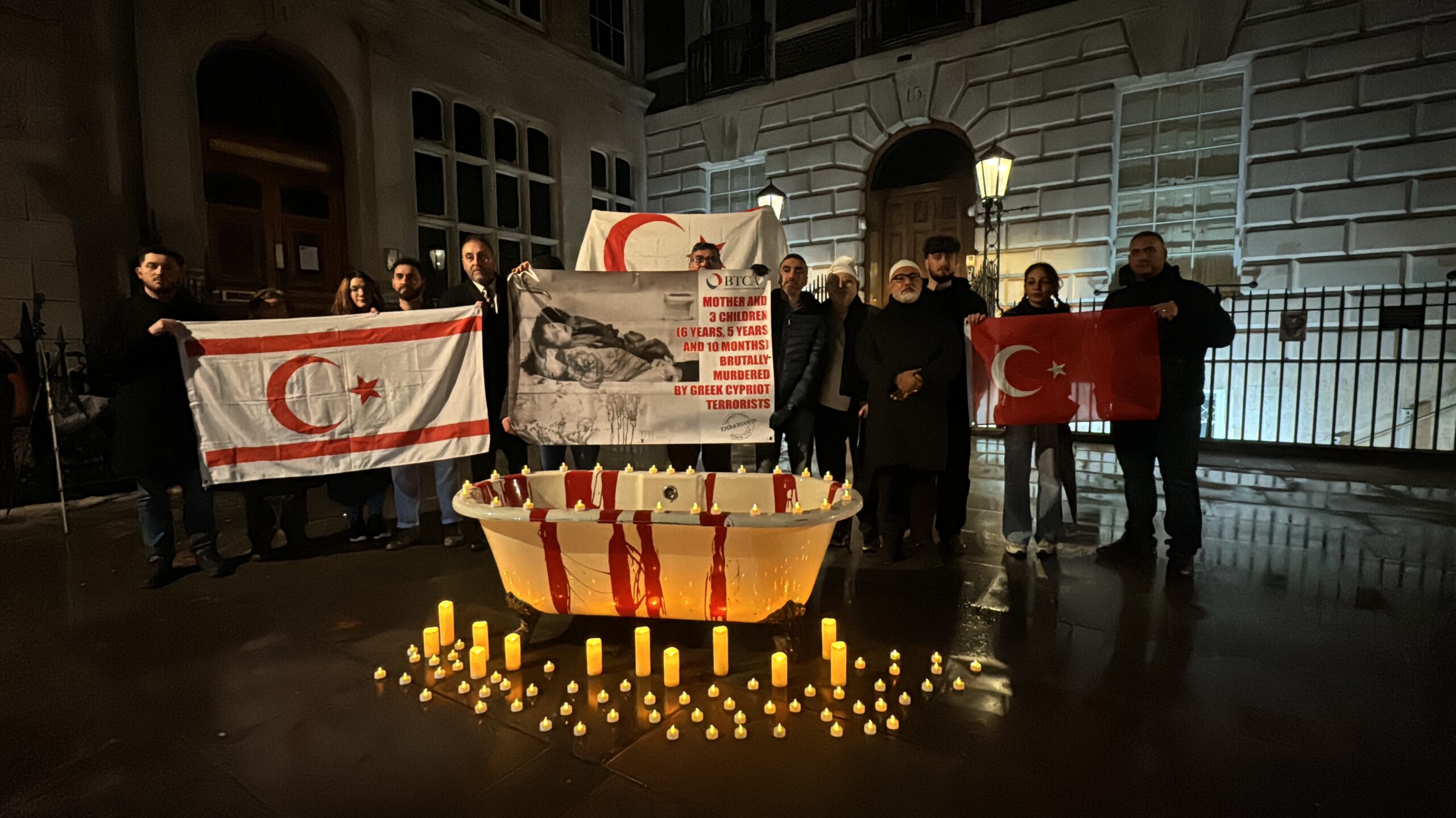 İngiltere Kıbrıslı Türkler Derneği (BTCA) tarafından başkentteki Kıbrıs Rum Kesimi Yüksek Komiserliği önünde düzenlenen anma etkinliğinde, Rumların Kıbrıs’ta yaptığı katliamda hayatını kaybedenler anıldı.