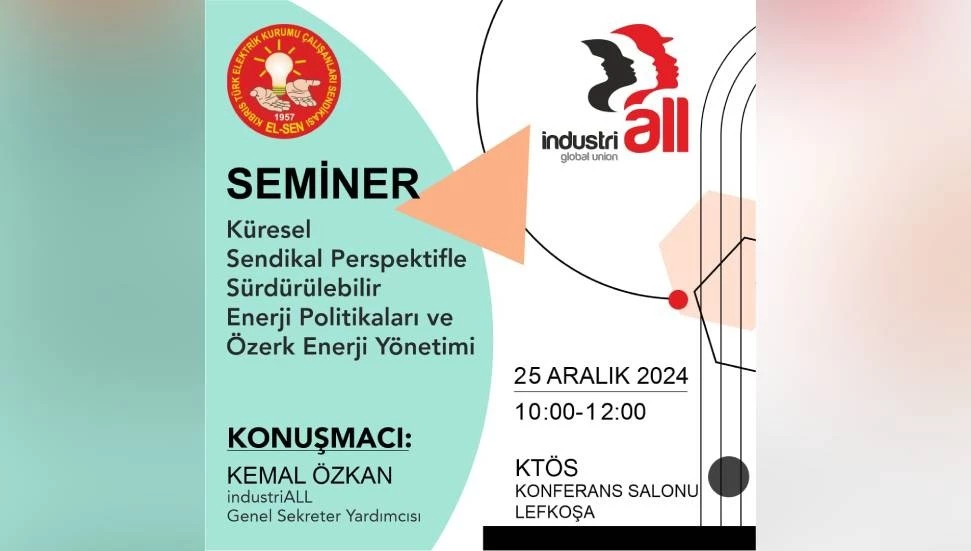 Kıbrıs Türk Elektrik Kurumu Çalışanları Sendikası (EL-SEN), merkezi Cenevre’de bulunan Küresel Sanayi, Enerji ve Maden İşçileri Federasyonu İndustriALL’un Genel Sekreter Yardımcısı Kemal Özkan’ın konuşmacı olarak yer alacağı bir seminer düzenleyecek.
