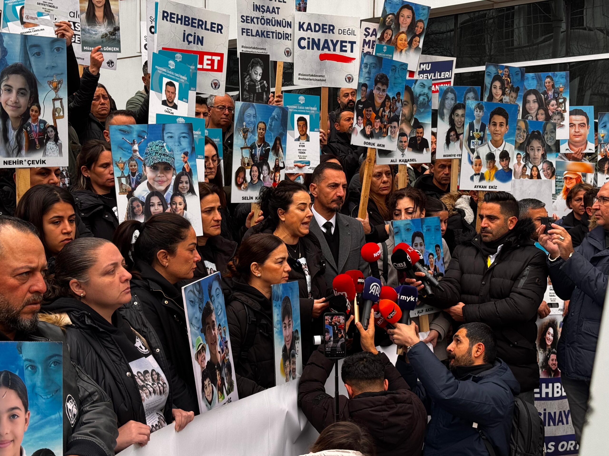 Şampiyon Melekler ve tur rehberlerinin aileleri her davda olduğu gibi mahkeme önünde toplanarak, depremde kaybettikleri çocuklarının, sevdiklerinin resimlerini girişe sıraladı.