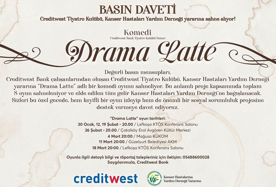 Creditwest Bank çalışanlarından oluşan Creditwest Tiyatro Kulübü’nün Kanser Hastaları Yardım Derneği yararına sahneleyeceği “Drama Latte” adlı bir komedi oyunu bu akşam seyirciyle buluşuyor.