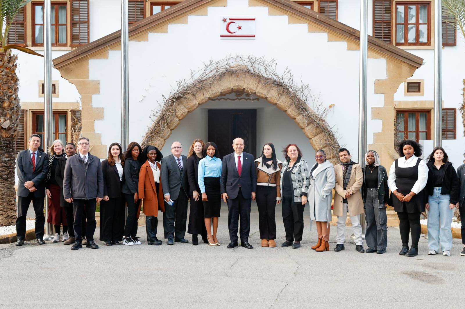 Cumhurbaşkanı Ersin Tatar, Girne Amerikan Üniversitesi (GAÜ) Siyasal Bilimler Fakültesi öğrencilerini kabul etti; Kıbrıs sorunu ve KKTC hakkında bilgiler verdi.