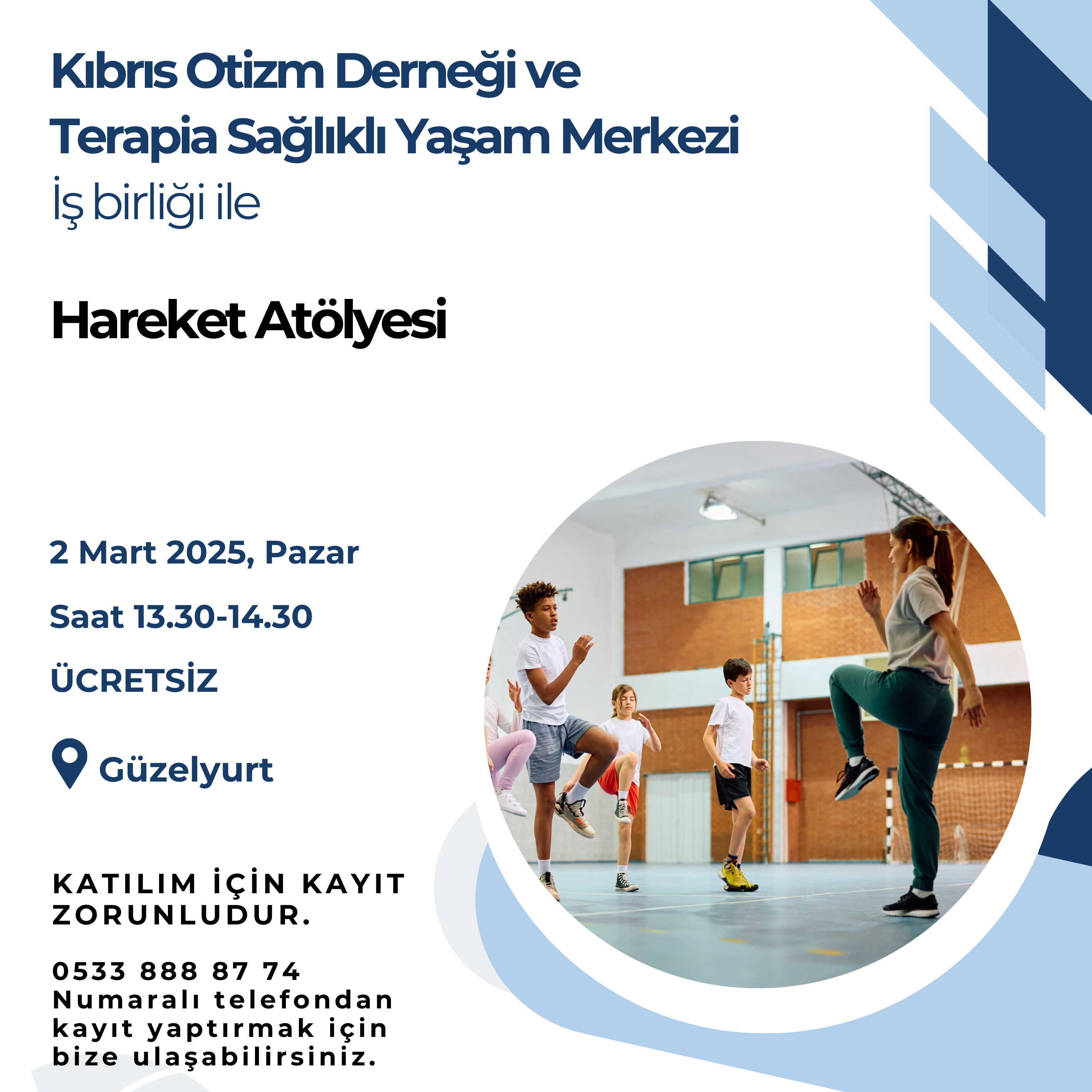 Kıbrıs Otizm Derneği ve Terapia Sağlıklı Yaşam Merkezi iş birliğinde 2 Mart Pazar günü Güzelyurt’ta ücretsiz “Hareket Atölyesi” düzenlenecek.