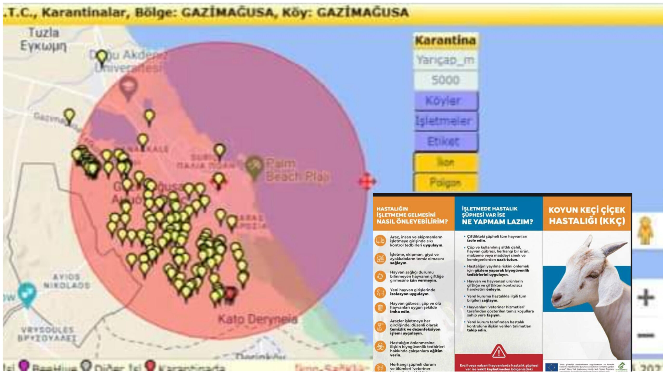Gazimağusa Organize Hayvancılık bölgesinde iki adet küçükbaş çiftliğinde bulaşıcı hastalıklardan olan Koyun Keçi Çiçek Hastalığı tespit edilmiştir.
