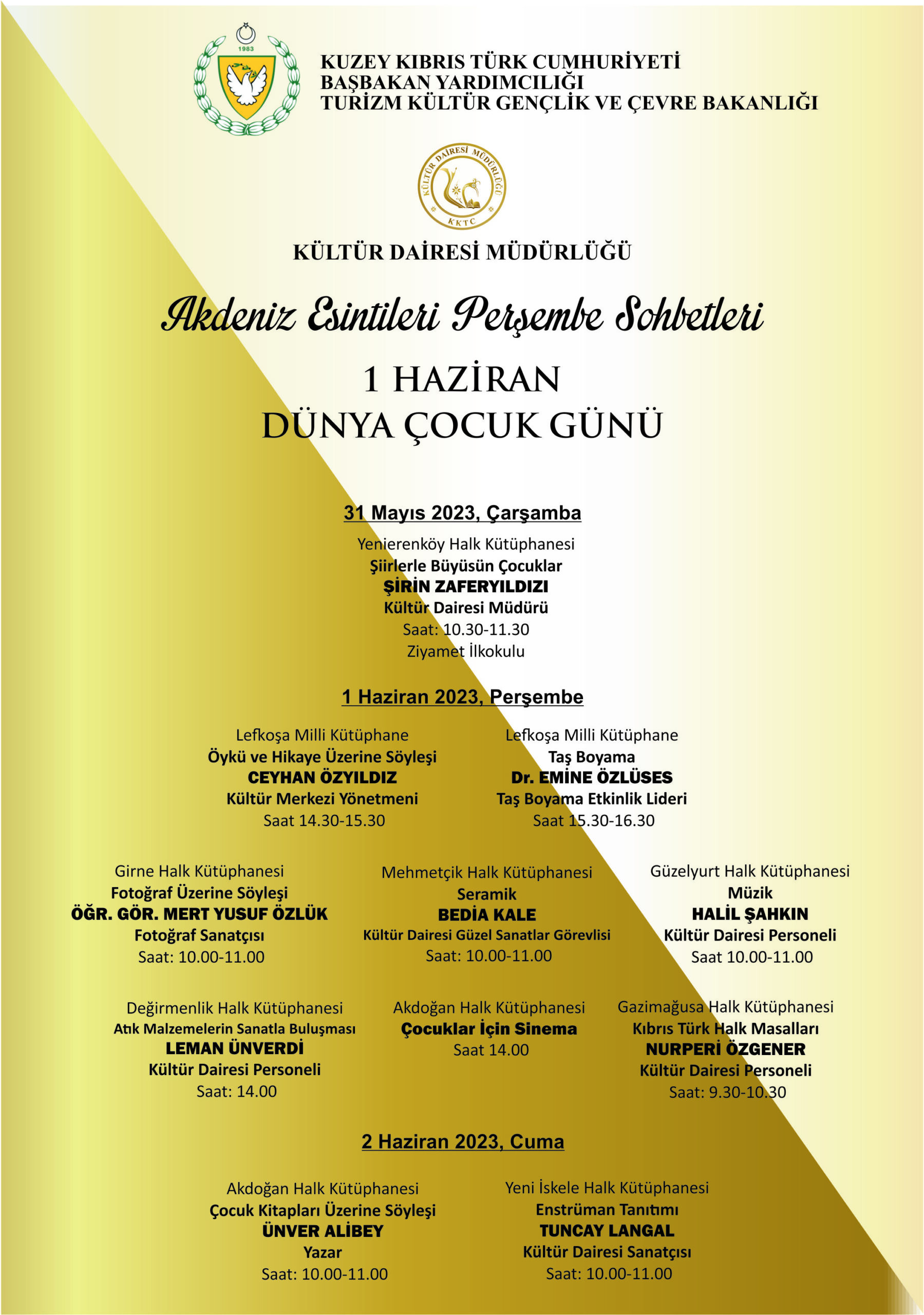 Başbakan Yardımcılığı, Turizm, Kültür, Gençlik ve Çevre Bakanlığı’na bağlı Kültür Dairesi’nden verilen bilgiye göre, Akdeniz Esintileri Perşembe Sohbetleri kapsamında düzenlenecek etkinlik çarşamba günü başlayacak. Buna göre, Yenierenköy Halk Kütüphanesi, 31 Mayıs Çarşamba günü Ziyamet İlkokulu’nda 10.30-11.30 saatleri arasında “Şiirlerle Büyüsün Çocuklar” etkinliği düzenleyecek.