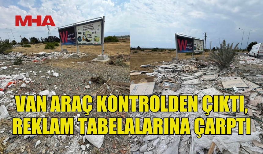 Güzelyurt-Mevlevi çemberinde dün meydana gelen trafik kazasında, hırdavat malzemeleri taşıyan bir van araç kontrolden çıkarak reklam tabelalarına çarptı.