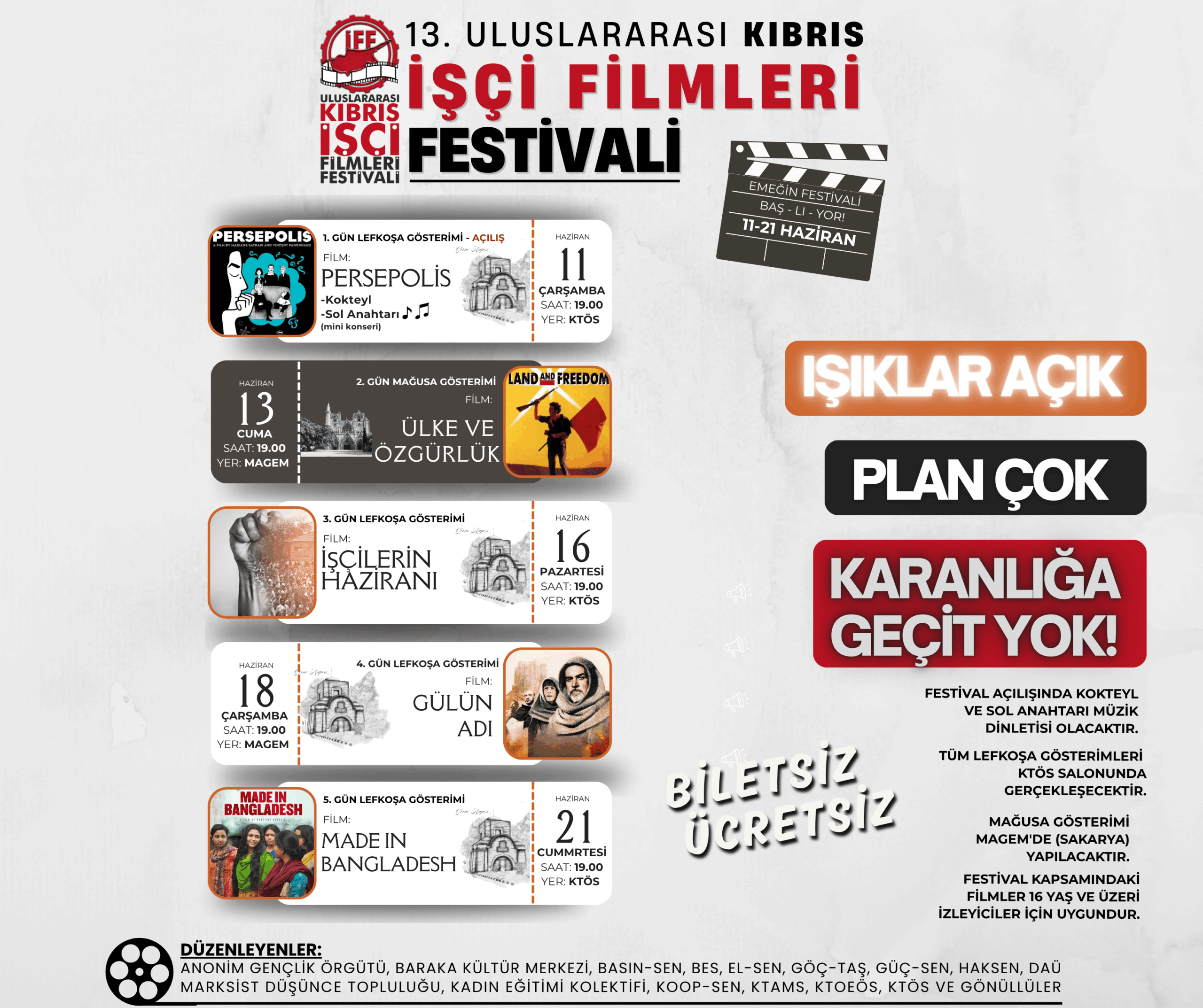 Açıklamada, Anonim Gençlik Örgütü, Baraka Kültür Merkezi, Basın-Sen, BES, El-Sen, Göç-Taş, Güç-Sen, Haksen, DAÜ Marksist Düşünce Topluluğu, Kadın Eğitimi Kolektifi, KOOP-SEN, KTAMS, KTOEÖS, KTÖS ve gönüllülerce hazırlanan festivalde tüm gösterimlerin ücretsiz ve biletsiz olacağı kaydedildi.
