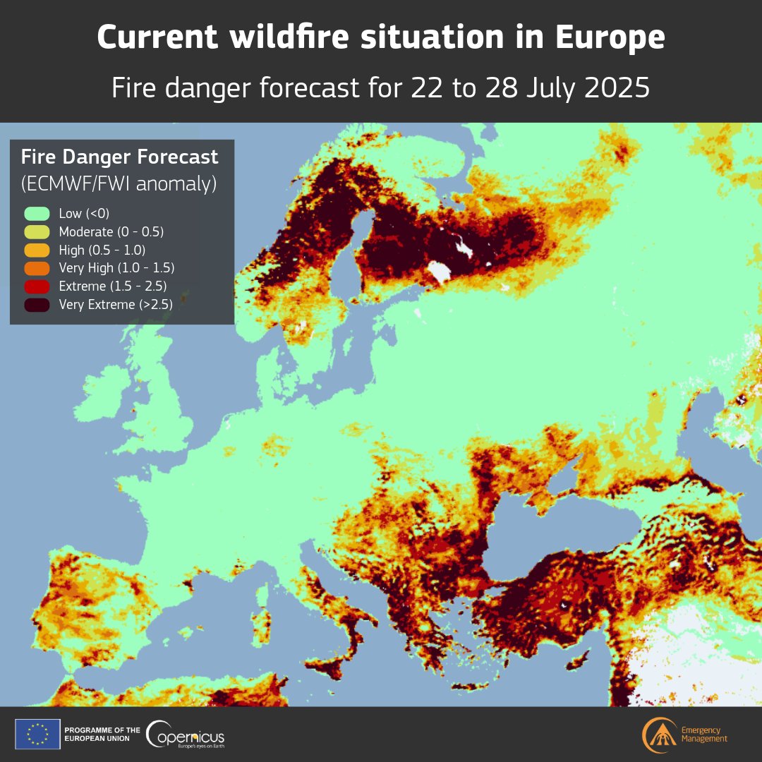 Yangın Hava Durumu Endeksi (FWI) tarafından 22-28 Temmuz tarihlerinde oluşturulan yangın riski haritasında da çok sayıda ülke “çok aşırı”, “aşırı”, “çok yüksek” ve “yüksek” seviyeleri işaret eden kırmızı tonlarıyla gösterildi.