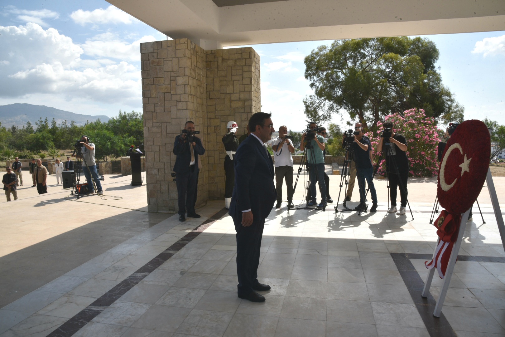 Anıta çelenk bırakan Türkiye Cumhurbaşkanı Yardımcısı Yılmaz, saygı marşı, saygı duruşu ve İstiklal Marşı’nın okunmasının ardından anıt özel defterini imzaladı.