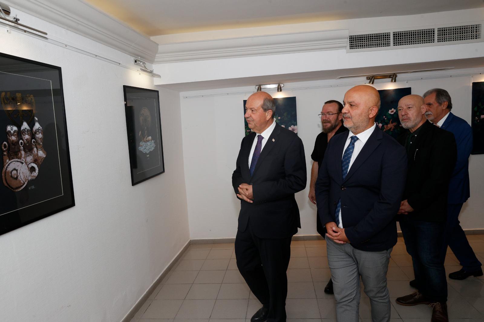 Eserleri sergilenen sanatçıları tebrik ederek, başarılar dileyen Cumhurbaşkanı Tatar, sanata verdiği destekten dolayı YDÜ kurucu rektörü Suat Günsel’e de teşekkür etti.