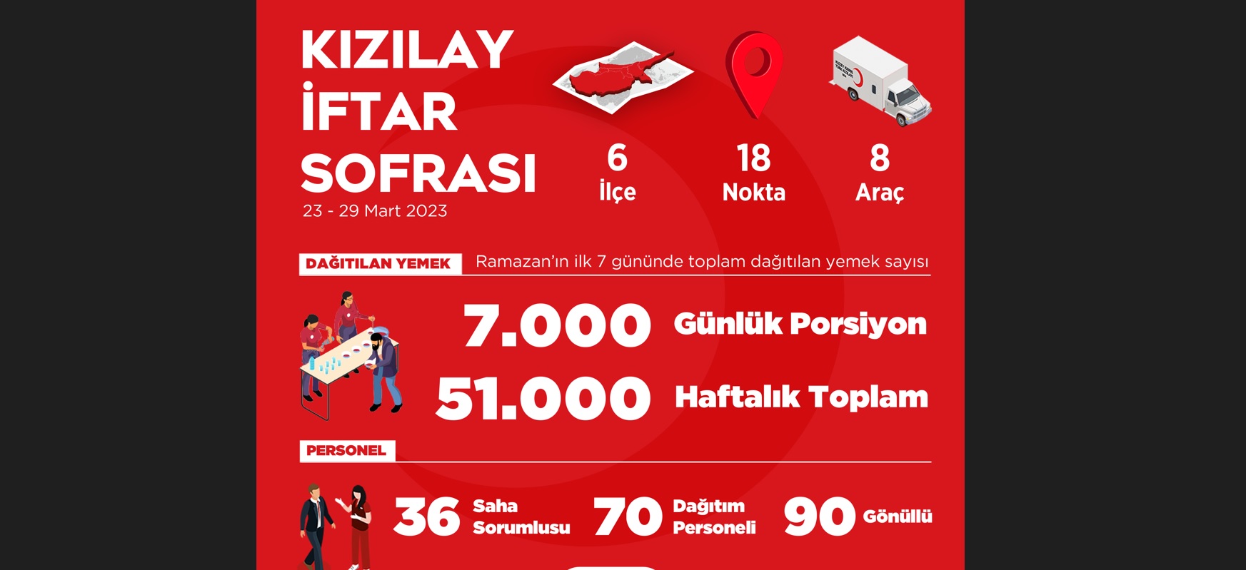 Ramazan ayı boyunca 6 ilçede 18 sabit noktada günde 7000 kişilik iftar yemeği hazırlanıyor. 36 saha sorumlusu, 70 dağıtım personeli ve 90 gönüllünün katkı koyduğu yemek dağıtım organizasyonuyla Ramazan’ın ilk haftasında toplam 51 bin kişiye iftar yemeği ikram edildi.