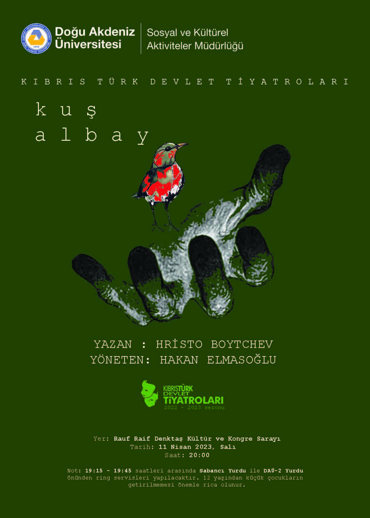 Doğu Akdeniz Üniversitesi (DAÜ) Sosyal ve Kültürel Aktiviteler Müdürlüğü, Kıbrıs Türk Devlet Tiyatroları’nın yeni oyunu “Kuş Albay”ı DAÜ ve Gazimağusa ile buluşturuyor.
