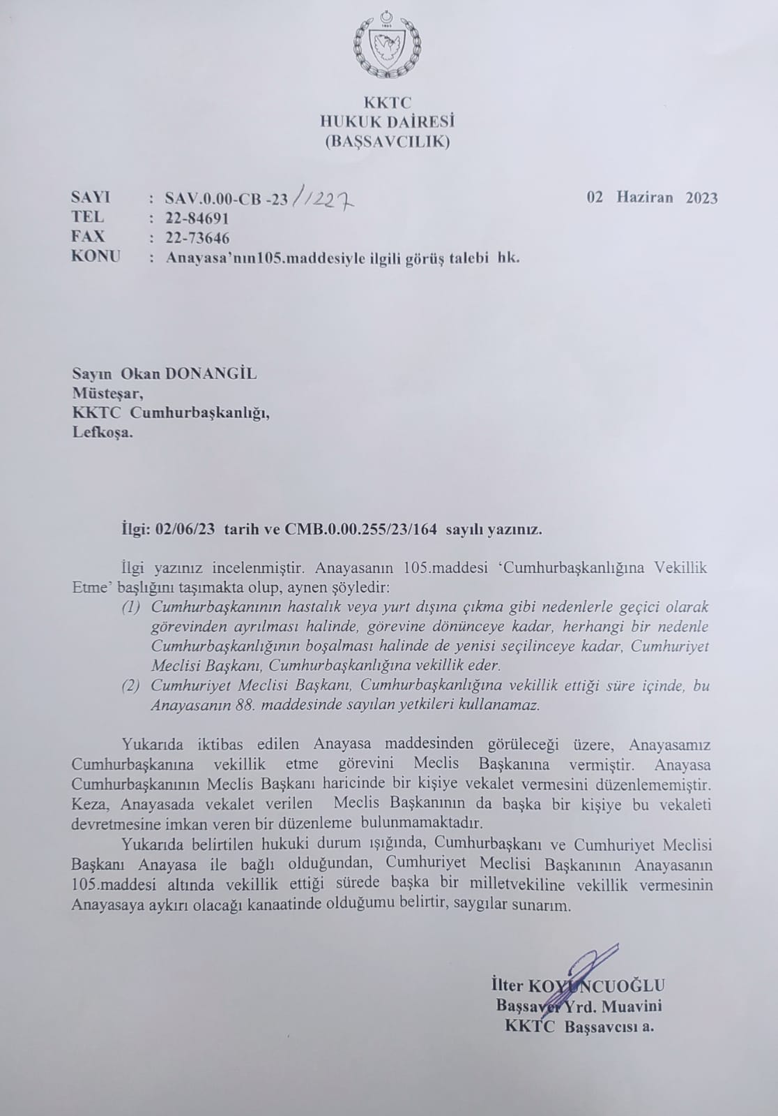 Türkiye Cumhuriyeti’nin 13’üncü Cumhurbaşkanı olarak seçilen Cumhurbaşkanı Recep Tayyip Erdoğan’ın göreve başlayacak olması nedeniyle 3 Haziran 2023 tarihinde Ankara’da düzenlenen törenlere davetli olarak katılacak olan Cumhurbaşkanı Ersin Tatar, Başsavcılık’tan aldığı hukuki görüş doğrultusunda 2 Haziran 2023 tarihinde Cumhurbaşkanlığı vekâletini Meclis Başkanı’na vermiştir.