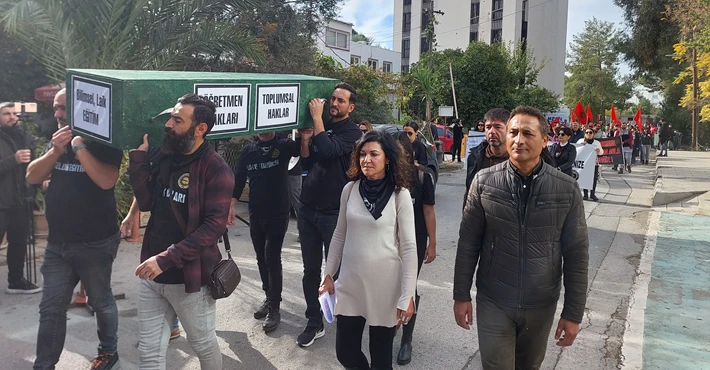 KTOEÖS Başkanı Eylem, toplumsal hakların, çağdaş, laik, bilimsel eğitimin, yasaların, tüzüklerin yok edilmek üzere olduğunu kaydederek, tabutun bunu sembolize ettiğini söyledi. Eylem, “Sayın Bakan buyursun bu cenazeyi kaldırsın” dedi.