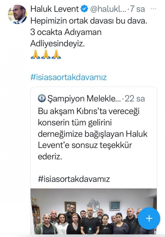 Haluk Levent sosyal medya hesabından Şampiyon Melekleri Yaşatma Derneği paylaşımını alıntılayarak “Hepimizin ortak davası bu dava. 3 ocakta Adıyaman Adliyesindeyiz.” paylaşımını yaptı.