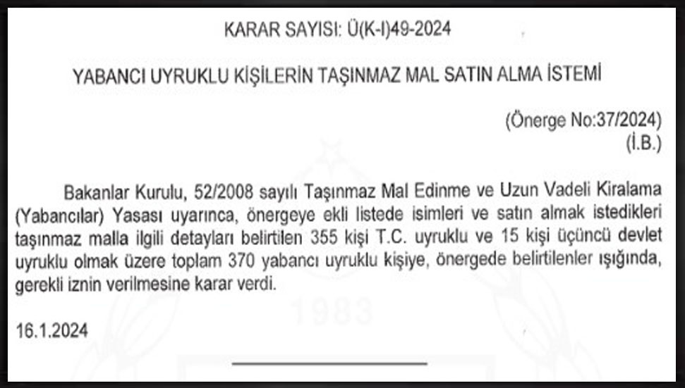 “Bakanlar Kurulu, 52/2008 sayılı Taşınmaz Mal Edinme ve Uzun vadeli Kiralama (Yabancılar) Yasası uyarınca, önergeye ekli listede isimleri ve satın almak istedikleri taşınmaz malla ilgili detayları belirtilen 355 kişi T.C. uyruklu ve 15 kişi üçüncü devlet uyruklu olmak üzere toplam 370 yabancı uyruklu kişiye, önergede belirtilenler ışığında, gerekli iznin verilmesine karar verdi.”