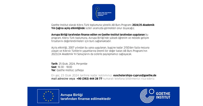 Açılış konuşmalarının Avrupa Komisyonu Yapısal Reform Destek Genel Müdürlüğü Kaynaklar, Koordinasyon ve Yardım Programı Direktörü Judit Rózsa ve Goethe-Institut Kıbrıs Direktörü Gabriele Gauler tarafından yapılacağı etkinlikte, Avrupa Birliği Burs Programı’nın 2024/25 Akademik Yılı Çağrısı konusunda bilgi paylaşımında bulunulacak.