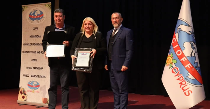 Düzenlenen törende İskele Belediyesi Halk Dansları Topluluğu Yönetmeni aynı zamanda CIOFF Kuzey Kıbrıs Başkanı olan Özlem Kadirağa, 2004 yılında CIOFF’a katılan, 2013 yılından itibaren de CIOFF Festivali olarak kabul edilen İskele Belediyesi Halk Dansları Topluluğu’na belgesini eğitmen aynı zamanda İskele Belediyesi İdari Sorumlusu Gülgün Dargın’a takdim etti.
