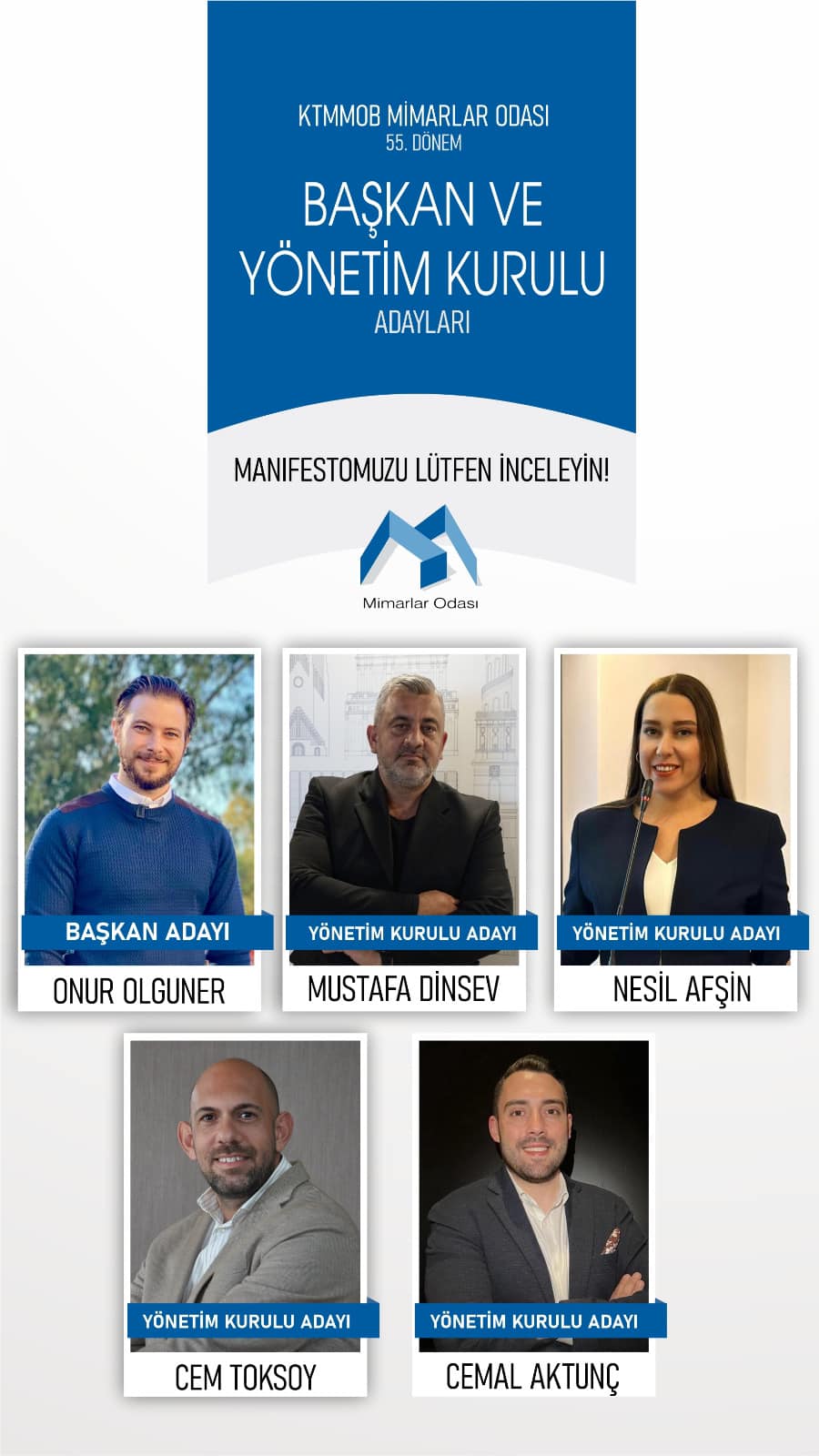 Bir 5 kişi ve şunu diyen bir yazı 'KTMMOB MİMARLAR ODASI 55. DÖNEM BAŞKAN VE YÖNETݰM KURULU ADAYLARI MANIFESTOMUZU LÜTFEN İNCELEYİN! へ Mimarlar Odası BAŞKAN ADAYI YÖNETݰM KURULU ADAYI ONUR OLGUNER MUSTAFA DINSEV YÖNETİM KURULU YÖNETM ADAYI NESİL AFŞİN YÖNETݰM KURULU ADAYI YÖNETݰM KURULU ADAYI CEM TOKSOY CEMAL AKTUNÇ' görseli olabilir