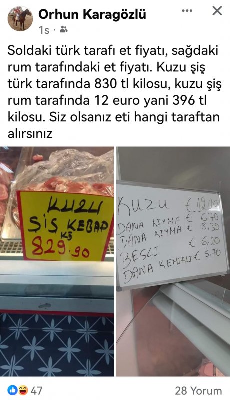 Sosyal medya hesabından Güneyde ki et fiyatının fotoğrafını yayınlayarak karşılaştıran Orhun Karagözlü, “Siz olsanız nerden alırdınız” diyerek veryansın etti.