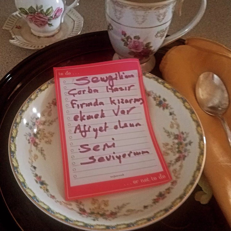 “Yemeğimini masama getirir, bir zoom görüşmesindeysem böyle sevgi dolu notlarla tepsimi hazırlayıp bırakırdı. Onun aşk ve sevgisini hayatın detaylarında yaşadım. Hem de öyle derin ve güzel yaşadım ki, şimdi bunlarda teselli arıyorum.”