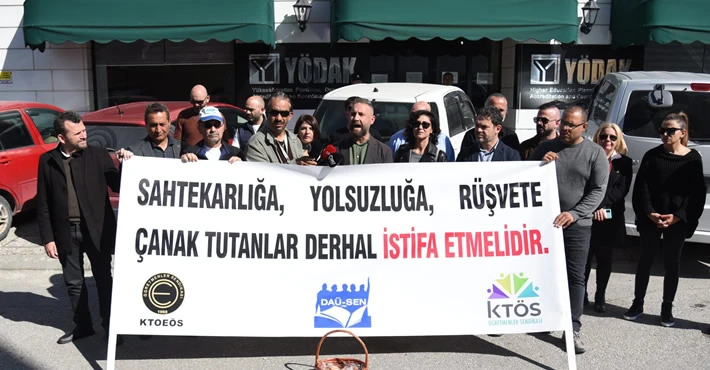 Kıbrıs Türk Öğretmenler Sendikası (KTÖS), Kıbrıs Türk Orta Eğitim Öğretmenler Sendikası (KTOEÖS) ve Doğu Akdeniz Üniversitesi Akademik Personel Sendikası (DAÜ-SEN) Yükseköğretim Planlama, Denetleme, Akreditasyon ve Koordinasyon Kurulu (YÖDAK) önünde eylem yaptı.