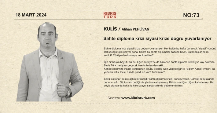 Sahte diploma krizi siyasi krize doğru yuvarlanıyor. Her halde bu hafta daha çok “siyasi” yönünü tartışacağız gibi geliyor bana. Sonra bu sahte diplomalar sadece KKTC vatandaşlarına mı verildi? Türkiye’den kimseye verilmedi mi?