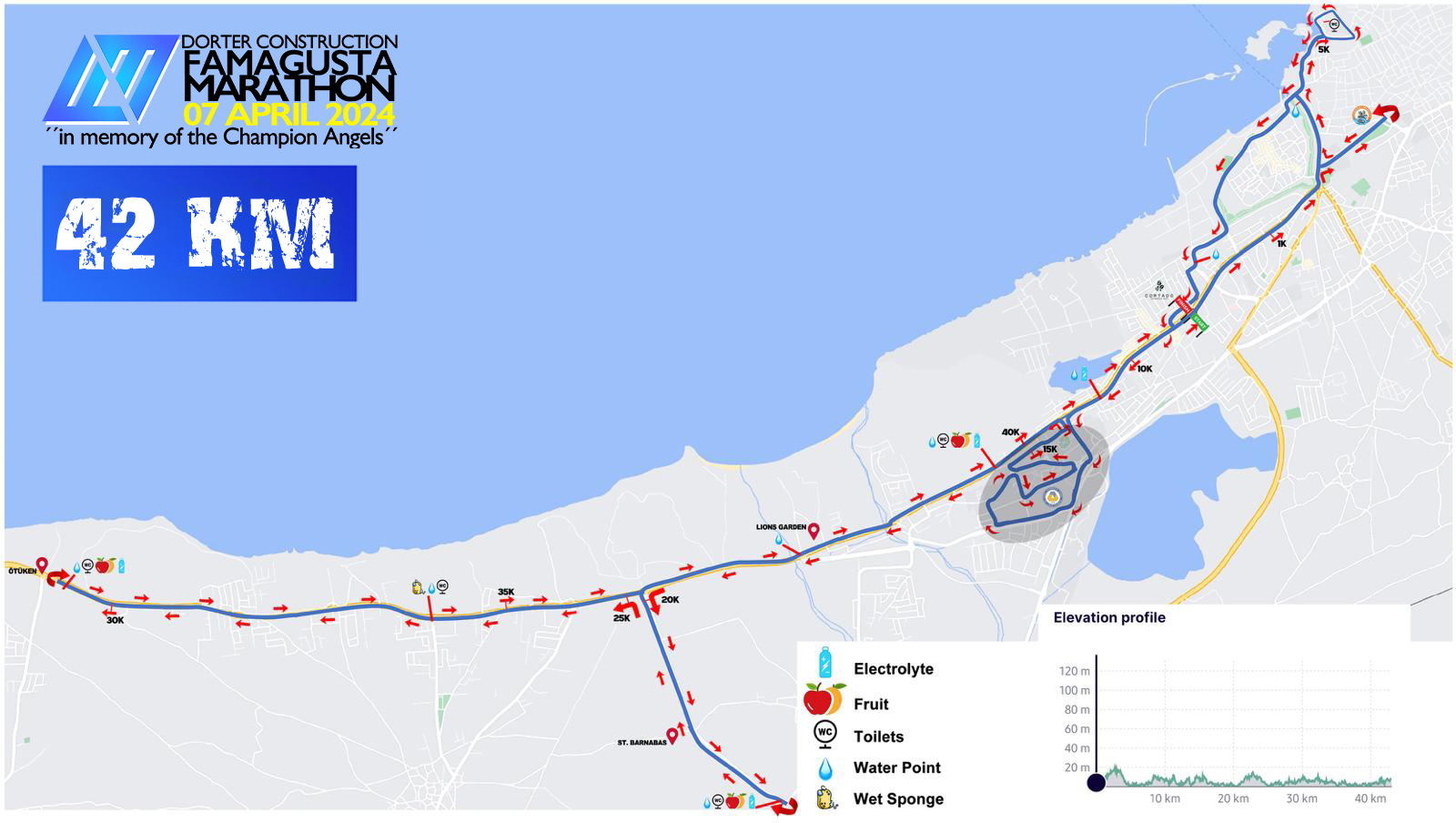 06.45’te başlayacak olan 42 kilometrelik maratona İsmet İnönü Bulvarı’ndan start verilecek. Bu kapsamda, İsmet İnönü Bulvarı, Anıt çemberi, Fevzi Çakmak Bulvarı, Polatpaşa Bulvarı, Havva Şentürk Yolu, Kemal Server Caddesi, Nadir Sokak, Canbulat Sokak, Cengiz Topel Caddesi, Erdoğan Acar Caddesi, Serbest Liman Yolu Sokak, Eşref Bitlis Caddesi, Onur Sokak, Yayla Sokak, Başbuğ Sokak, Zorbalar Sokak, Manolya Sokak, İsmet İnönü Bulvarı, DAÜ içi, Salamis Yolu Doğu Şeridi, St. Barnabas Yolu, Ötüken kavşağı doğu şeridi trafik akışına kapalı olacak.