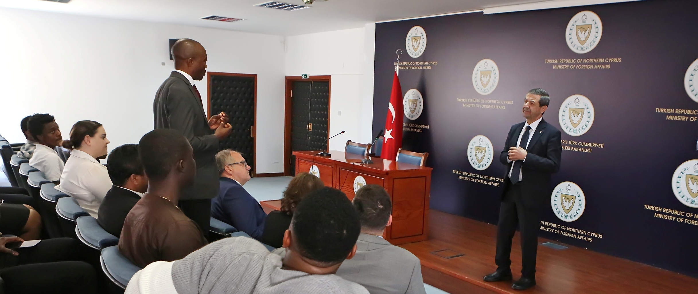 Bakanlıktan verilen bilgiye göre, Dışişleri Bakanı Ertuğruloğlu, öğrenci ve akademisyenlerden oluşan heyete Dışişleri Bakanlığı Uğur Umar Konferans Salonu’nda Kıbrıs brifingi verdi.