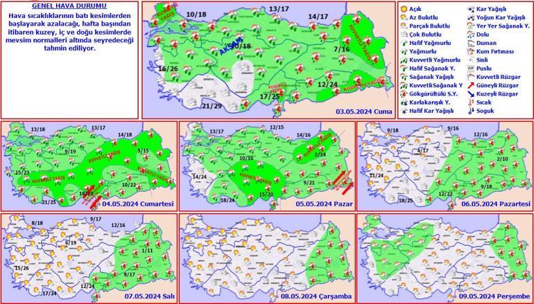 Yurdun kuzey, iç ve doğu kesimlerinin parçalı ve çok bulutlu, Marmara’nın kuzeyi, İç Anadolu’nun güney ve doğusu, Doğu Akdeniz, Karadeniz, Doğu ve Güneydoğu Anadolu ile Antalya’nın iç kesimlerinin sağanak ve yer yer gök gürültülü sağanak yağışlı, diğer yerlerin az bulutlu geçeceği tahmin ediliyor. Yağışların Orta ve Doğu Karadeniz, Doğu Anadolu, Güneydoğu Anadolu’nun kuzey ve doğusu, Sinop, Sivas, Kahramanmaraş ve Osmaniye çevreleri ile Adana’nın kuzey kesimlerinde yerel olarak kuvvetli olması bekleniyor.
