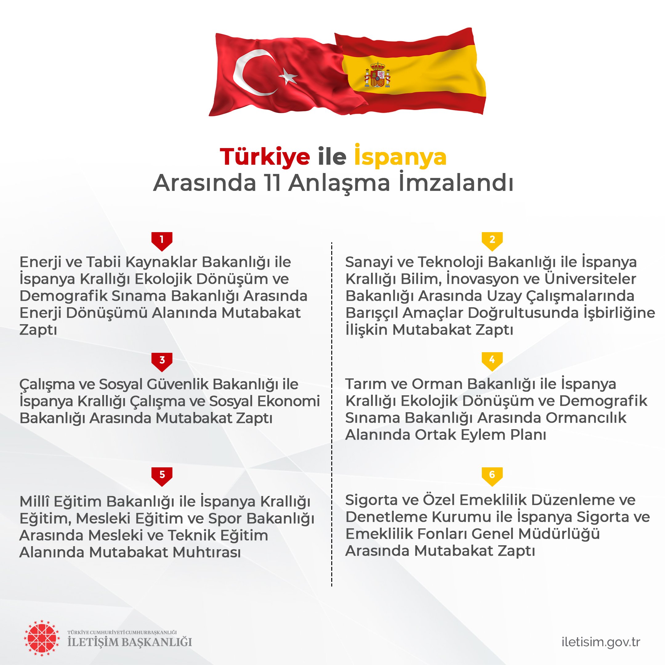 Görüşmenin ardından, Cumhurbaşkanı Erdoğan ve Başbakan Sanchez huzurunda iki ülke arasında 11 anlaşma imzalandı. Sanayi ve Teknoloji Bakanlığı ile İspanya Krallığı Bilim, Yenilikçilik ve Üniversiteler Bakanlığı Arasında Bilimsel ve Teknolojik İşbirliği Mutabakat Zaptını Türkiye adına Sanayi ve Teknoloji Bakanı Mehmet Fatih Kacır ve İspanya Dışişleri Bakanı Jose Manuel Albares imzaladı.