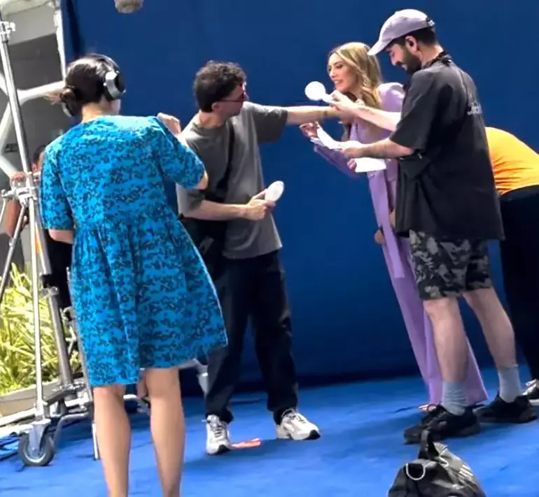 Sıcak hava nedeniyle zor anlar yaşayan oyuncu, mini bir fan ile serinlemeye çalıştı.