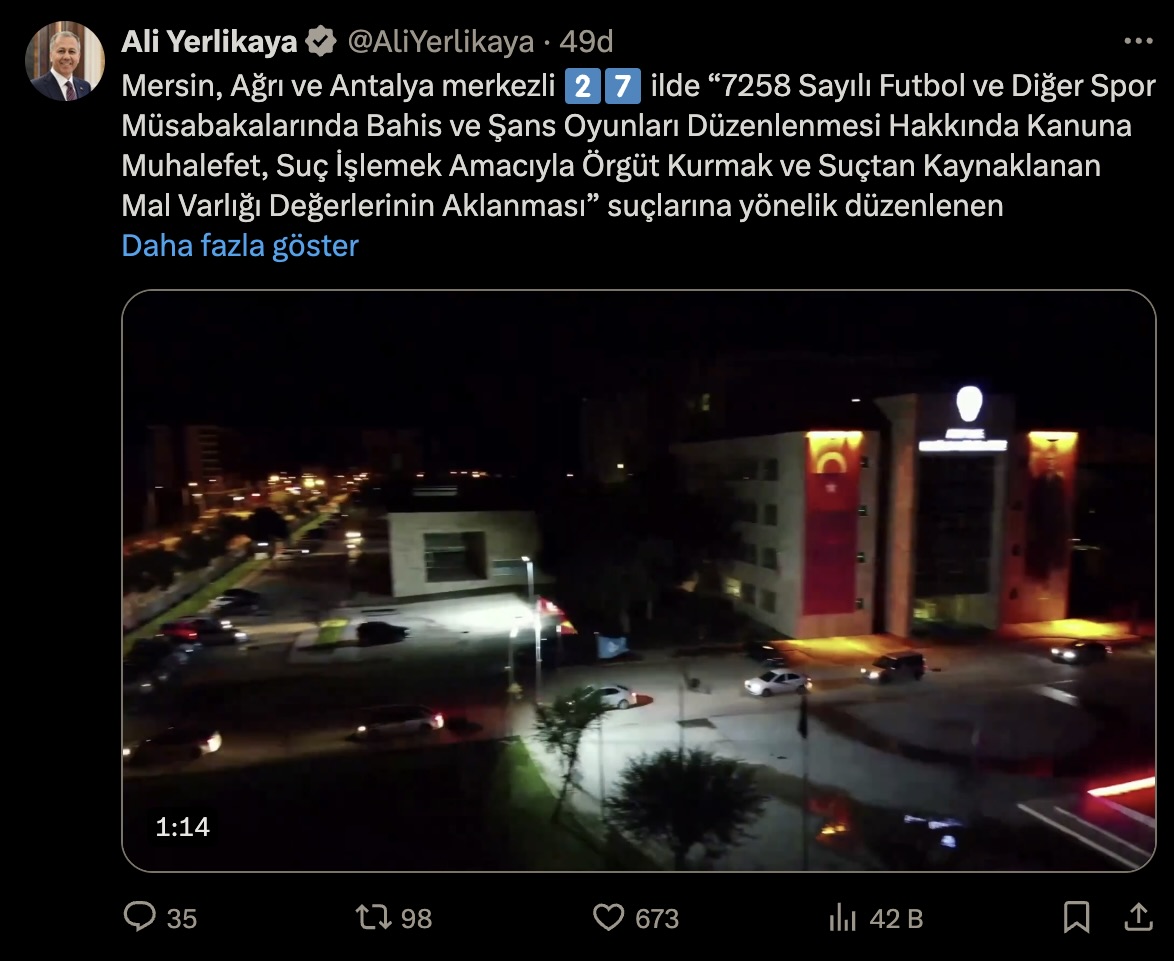 Yerlikaya’nın sosyal medya hesabından yaptığı açıklamaya göre, Emniyet Genel Müdürlüğü Siber Suçlarla Mücadele Daire Başkanlığı koordinesinde, Mersin, Ağrı ve Antalya merkezli 27 ilde “7258 sayılı Futbol ve Diğer Spor Müsabakalarında Bahis ve Şans Oyunları Düzenlenmesi Hakkında Kanun’a muhalefet”, “suç işlemek amacıyla örgüt kurmak” ve “suçtan kaynaklanan mal varlığı değerlerinin aklanması” suçlarını işleyen zanlıların yakalanması amacıyla “Sibergöz-47” operasyonları düzenlendi.