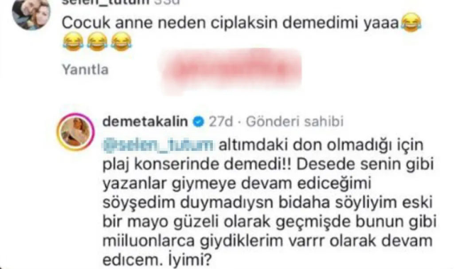 Akalın, başka bir takipçisinin “Çocuk, anne neden çıplaksın demedi mi?” yorumuna ise “Altımdaki don olmadığı için plaj konserinde demedi.