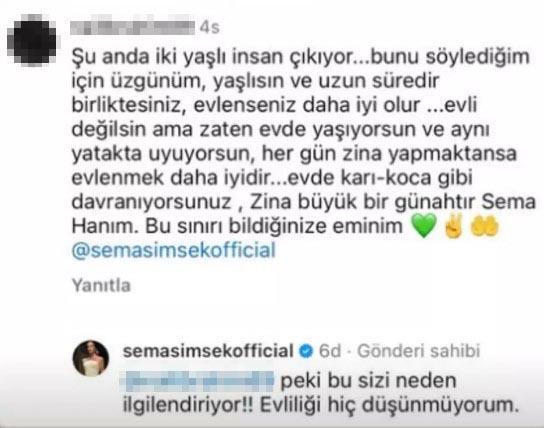 Sevgilisiyle denizdeki pozları kısa sürede sosyal medyada gündem olan Sema Şimşek’in 5 yıldır aşk yaşayıp evlenmemesine tepki gösteren bir kullanıcı “Şu anda iki yaşlı insan çıkıyor. Bunu söylediğim için üzgünüm yaşlısın ve uzun süredir birliktesiniz. Evlenseniz daha iyi olur. Evli değilsin ama zaten aynı evde yaşıyorsun ve aynı yatakta uyuyorsun. Her gün zina yapmaktansa evlenmek daha iyidir. Evde karı-koca gibi davranıyorsunuz. Zina büyük bir günahtır Sema Hanım. Bu sınırı bildiğinize eminim” dedi. Gelen yoruma sessiz kalmayan Sema Şimşek ise “Peki bu sizi neden ilgilendiriyor? Evliliği hiç düşünmüyorum” ifadelerini kullandı.