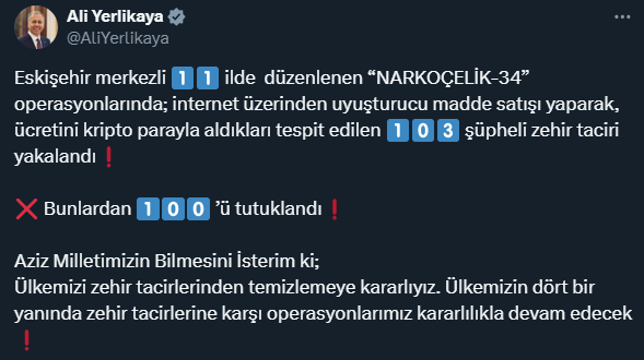 Düzenlenen operasyonlara 150 ekip, 500 personel, 11 narkotik dedektör köpeği ve hava destekli unsurlar katıldı ve 74 farklı adrese çalışma yapıldı. Operasyonlar sonucu internet üzerinden uyuşturucu madde satışı yaparak ücretini kripto parayla aldıkları tespit edilen 103 şüpheli yakalandı ve bunlardan 100 ‘ü tutuklandı.