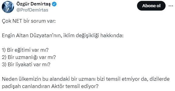 Zirvede Engin Altan Düzyatan’ın Türkiye’yi temsil edecek olması tepkileri de beraberinde getirdi. Kısa sürede adı trend listesine giren oyuncu için ilk yorumlardan biri Özgür Demirtaş’tan geldi. Düzyatan’ın bu etkinlikte olmasını eleştiren Demirtaş, “Çok net bir sorum var: Engin Altan Düzyatan’ın iklim değişikliği hakkında: