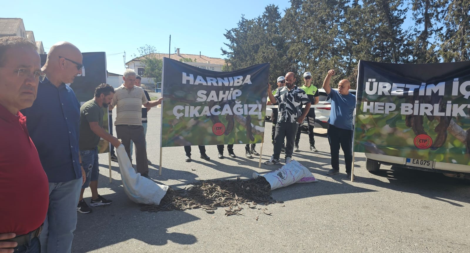 Harnup üreticileri sorunlarını protesto etmek amacıyla İskele Boğaz bölgesinde bulunan Harup Ürünleri Kooperatif tesisinin önünde eylem gerçekleştirdi.