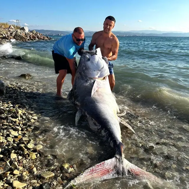 Kocaeli’nin Gebze ilçesi kıyılarında avlanmak için denize açılan Görkem Gürsoy ve Volkan Topçu, ender görülen mavi yüzgeçli, 2.5 metre uzunluğunda, 320 kilogram ağırlığında orkinos avladı.