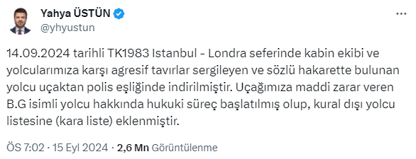 Sosyal medya hesabından açıklama yapan Türk Hava Yolları (THY) Basın Müşaviri Yahya Üstün, “14.09.2024 tarihli TK1983 İstanbul-Londra seferinde kabin ekibi ve yolcularımıza karşı agresif tavırlar sergileyen ve sözlü hakarette bulunan yolcu uçaktan polis eşliğinde indirilmiştir. Uçağımıza maddi zarar veren B.G. isimli yolcu hakkında hukuki süreç başlatılmış olup, kural dışı yolcu listesine (kara liste) eklenmiştir” ifadelerini kullandı.