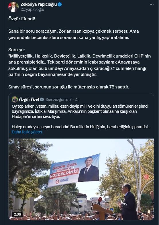 Soru şu: ‘Milliyetçilik, Halkçılık, Devletçilik, Laiklik, Devrimcilik umdeleri CHP’nin ana prensipleridir… Tek parti döneminin icabı sayılarak Anayasaya sokulmuş olan bu 6 umdeyi Anayasadan çıkaracağız’ cümleleri hangi partinin seçim beyannamesinde yer almıştır. Sınav süresi, sorunun zorluğu ile mütenasip olarak 72 saattir.”