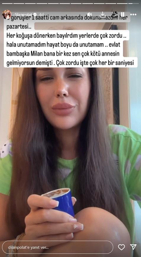 Paylaşımında cezaevinde geçirdiği zor günlere de değinen Polat, “O görüşler 1 saatti cam arkasında dokunmazdım pazartesi… Her koğuşa dönerken bayılırdım yerlerde çok zordu. Hala unutamadım, hayat boyu da unutamam. Evlat bambaşka Milan bana bir kez ‘Sen çok kötü annesin gelmiyorsun’ demişti. Çok zordu işte çok her bir saniye” ifadelerini kullandı.