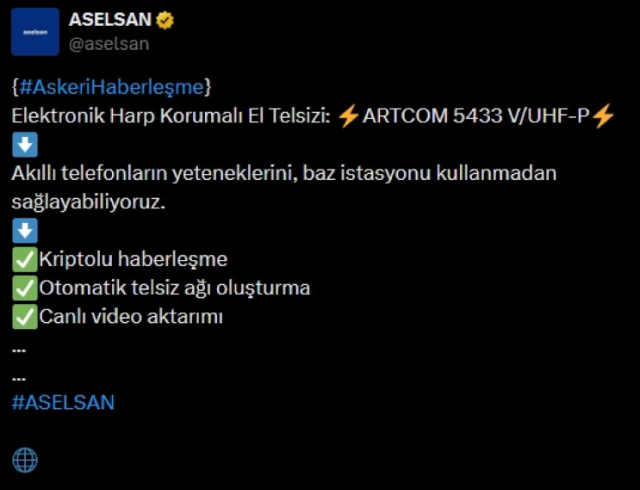 Lübnan’daki patlamaların ardından ASELSAN, geliştirdiği yerli ve milli el telsizi “ARTCOM 5433 V/UHF-P”nin görsellerini paylaşarak, güvenli haberleşme için yenilikçi çözümler sunduğunu duyurdu. Paylaşımda “Akıllı telefonların yeteneklerini, baz istasyonu kullanmadan sağlayabiliyoruz.” ifadelerine yer verildi.