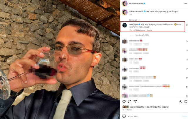 Yoğun bir konser maratonu bulunan Mert Demir, Instagram hesabından bir fotoğrafını yayınladı. Demir’in kendisini dışarıda bekletip fotoğraf paylaştığını gören Sarıkaya da paylaşımına “Ayıp ayıp aşağıdayım seni bekliyorum… Ama yağmur başladı” yorumunu yaptı. Sarıkaya’nın yorumuna kısa sürede binlerce beğeni geldi.