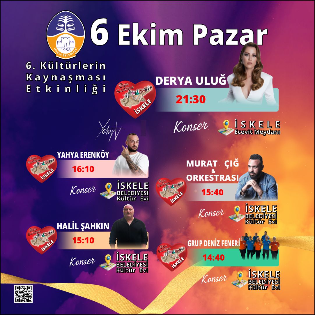İskele Belediyesi’nden verilen bilgiye göre, “Bizim sevdamız sizin de sevdanız olsun, 6 Ekim’de rotanız İskele olsun” sloganıyla düzenlenen etkinlik İskele Kent Merkezi’nde yer alacak. Etkinlik kapsamında saat 21.30’da şarkıcı Derya Uluğ sahne alacak.